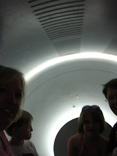 We had to leave the zoo at 1:30 to get to the Arch by 3:00. It was only a 10-15 minute van ride but we had to allow time to park in the paring garage, walk to the Arch, and stand in the enormous line for security. Then we stood in line for an hour to get in an elevator to go to the top. There are eight elevators at both the norht and south entrances to the Arch. Each elevator is a tiny egg shaped compartment which holds five people (imagine the egg form "Mork & Mindy"--seriously!). We were cramped in ours and we had three small children. We saw five guys in their late teens/early twenties get out of one. It was like a clown car. Anyway, all eight elevators leave at the same time--every 10 minutes. I would never have imagined that so many people would go to the top of the arch every day. Most of the tours for Saturday were sold out too. Crazy!!